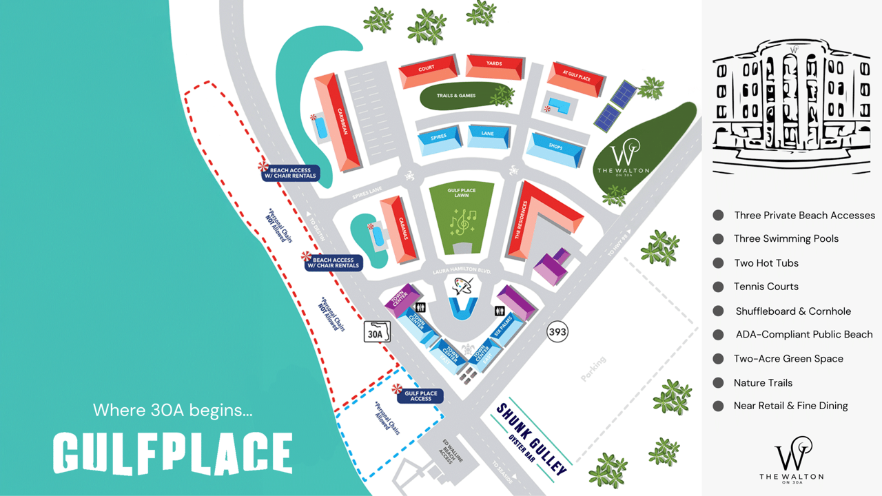 Located in the heart of the Gulf Place community, The Walton on 30A offers an exceptional setting that invites exploration and enjoyment of all that this vibrant area has to offer. Residents are just steps away from the stunning white sand beaches and crystal-clear waters of 30A, making every day feel like a coastal getaway.